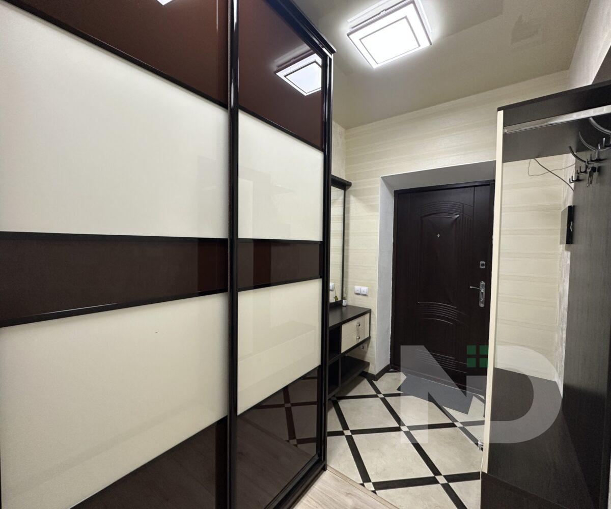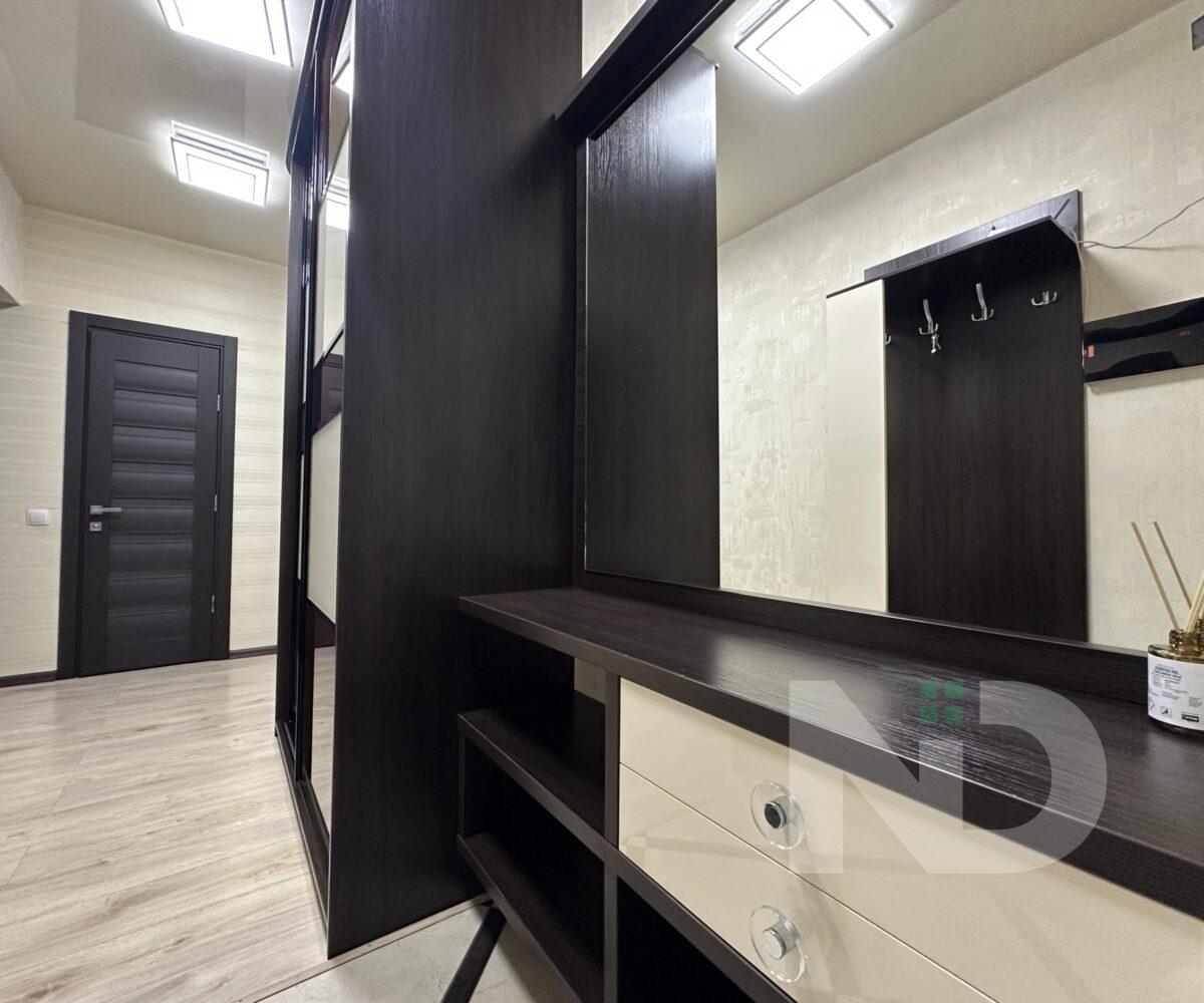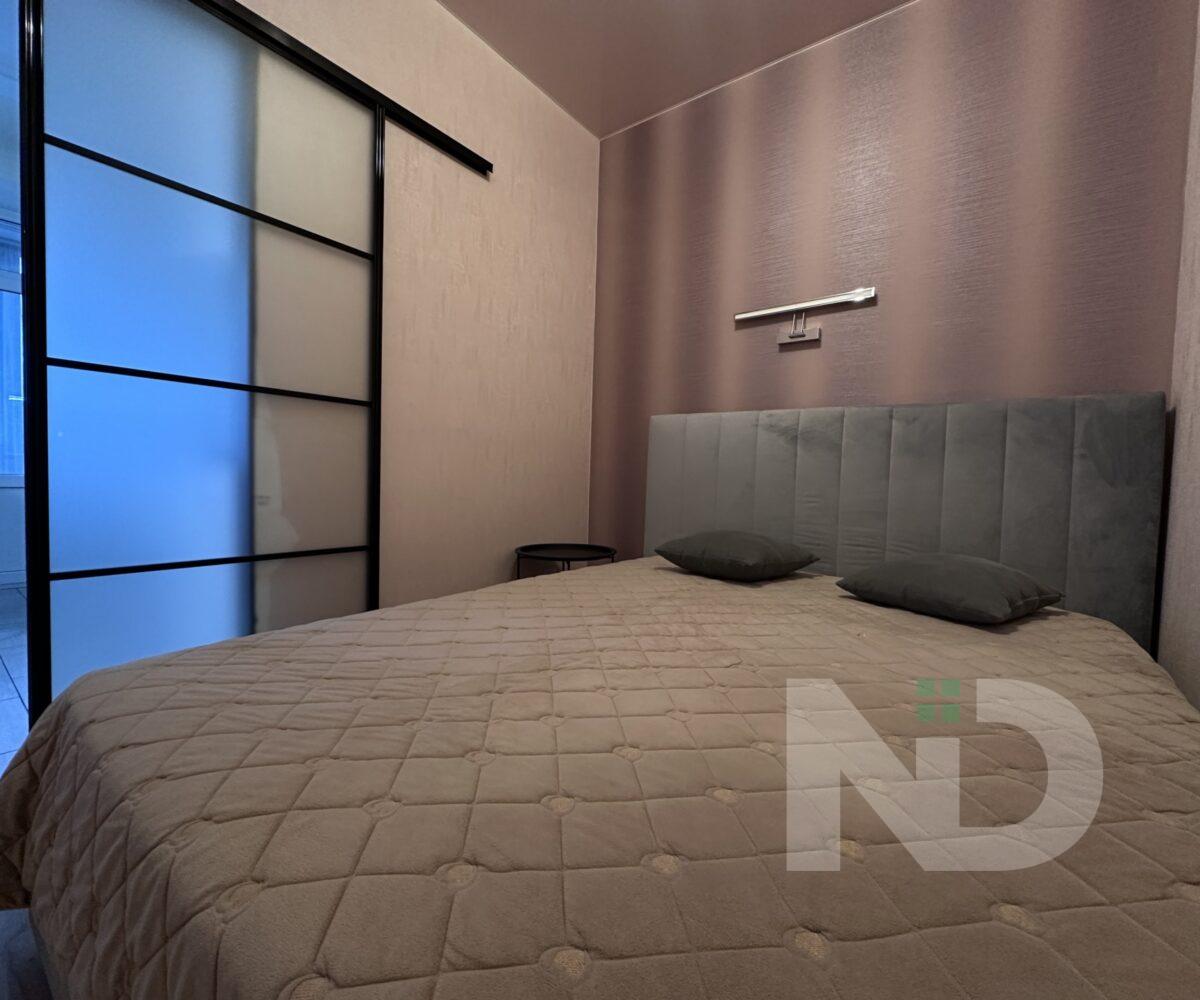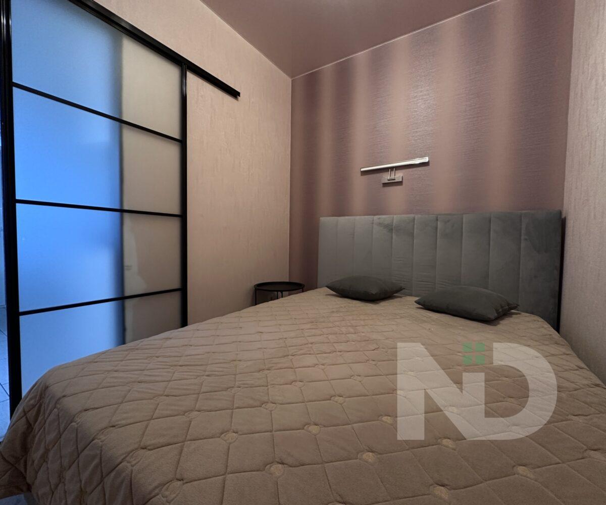 В квартире две отдельные комнаты: одна – полноценная спальня, которую можно использовать как детскую, рабочий кабинет или гостевую; вторая — комната площадью 8 м² без окна, оформленная в спокойных теплых тонах. Благодаря правильной планировке пространство в квартире чувствуется максимально функциональным.