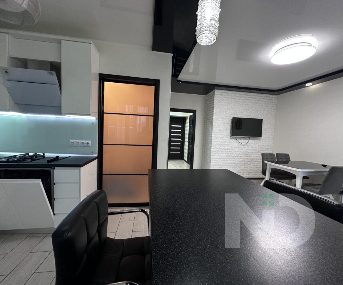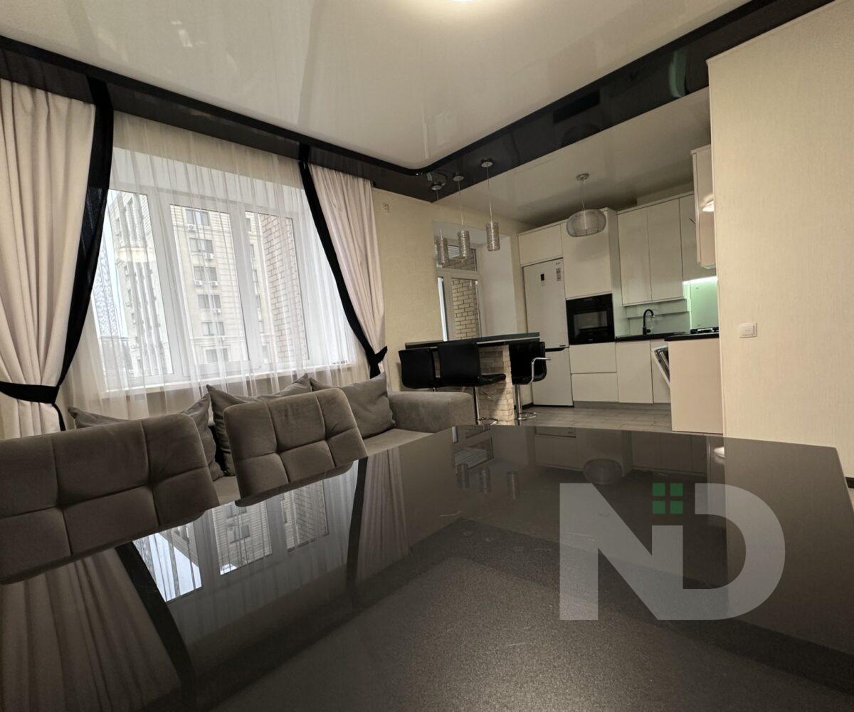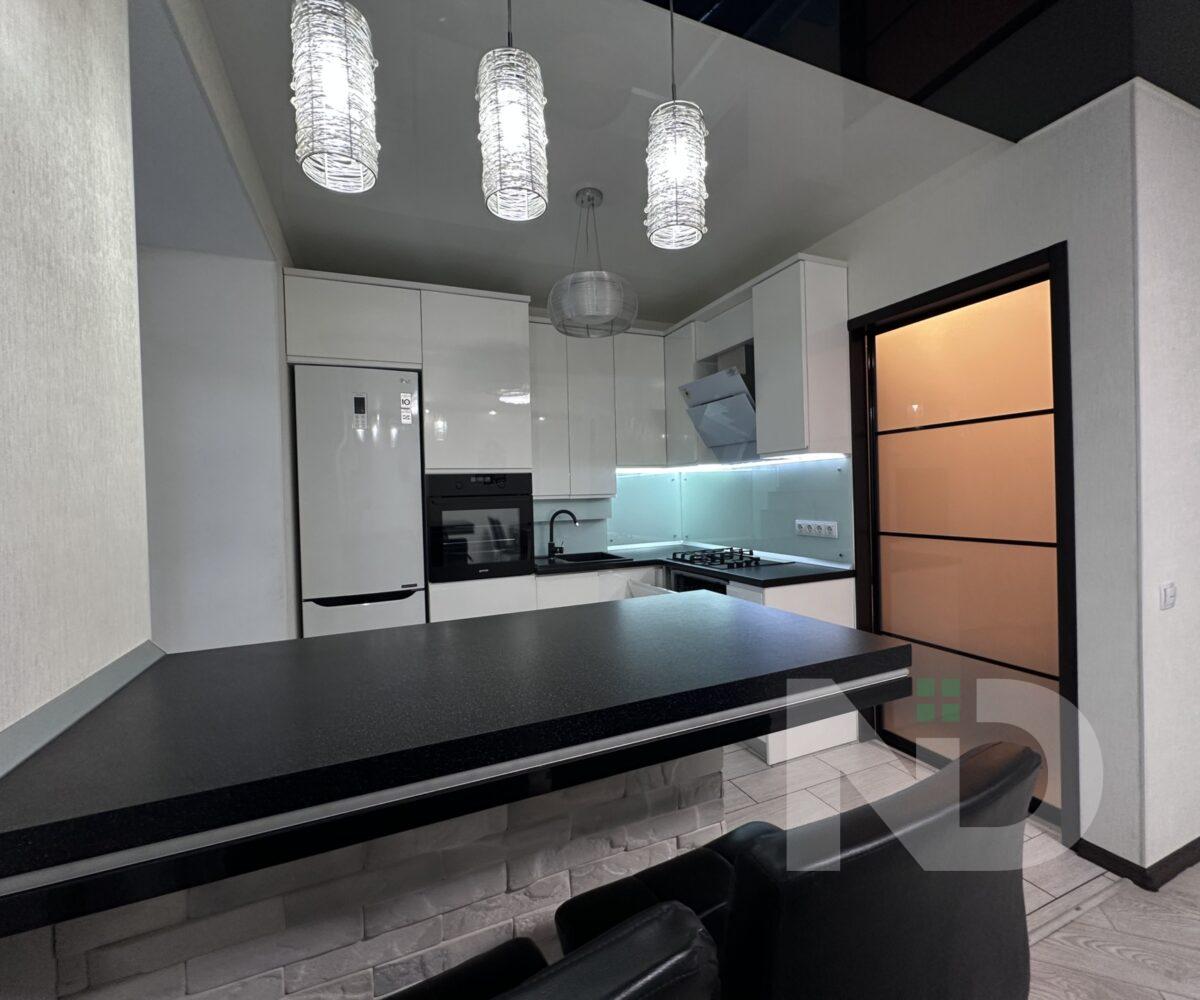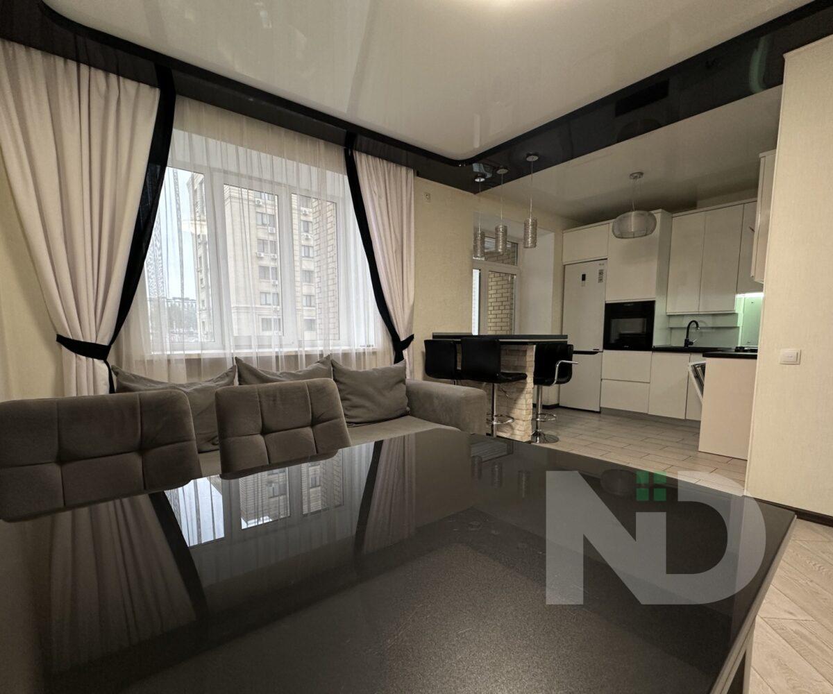 Квартира имеет большую просторную кухню-гостиную, которая является главной зоной для семейного отдыха и приема гостей. Светлый интерьер, панорамные окна и качественный ремонт создают атмосферу уюта и современности. Мебельная гостиная переходит в функциональную кухонную зону с барной стойкой, техникой и достаточным местом для хранения.