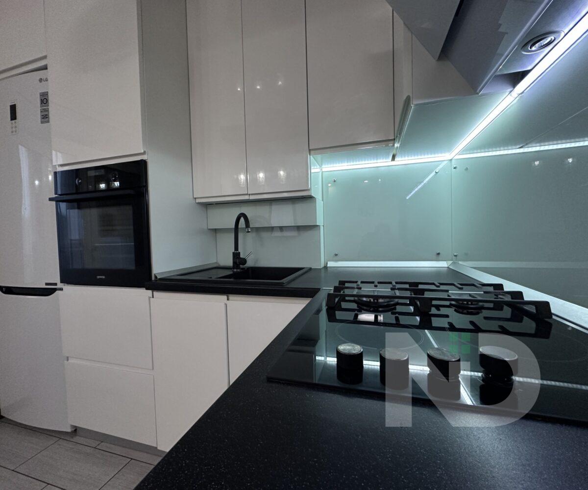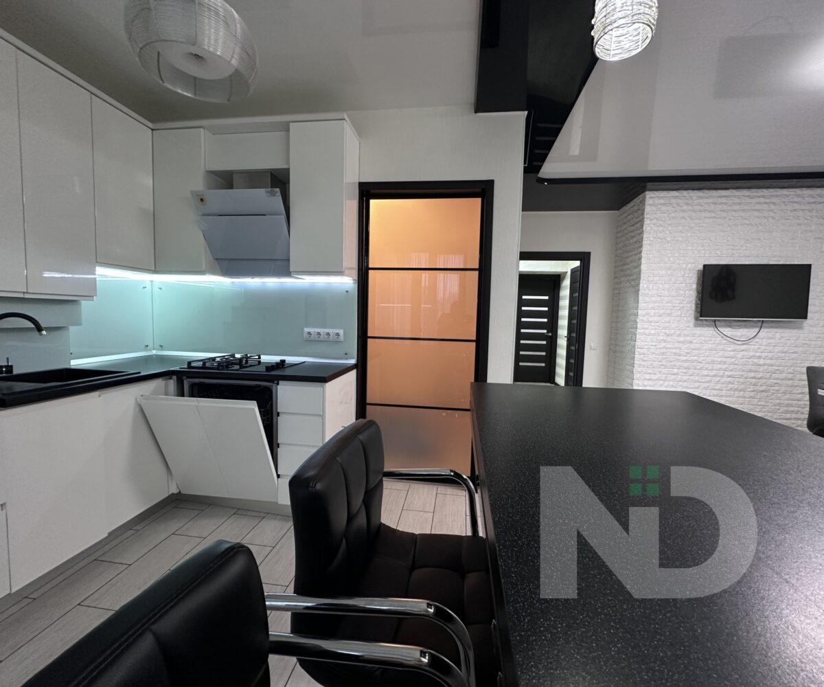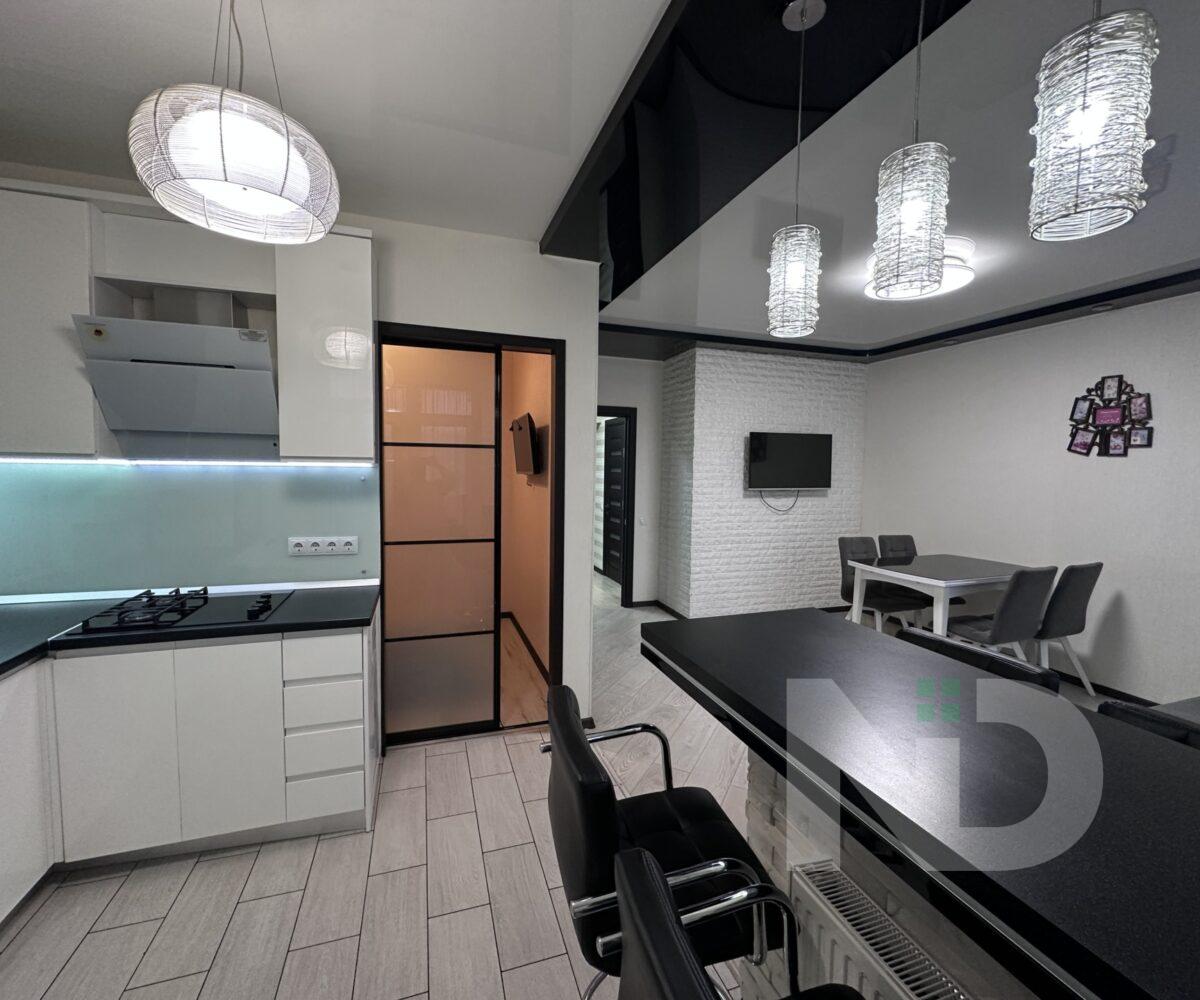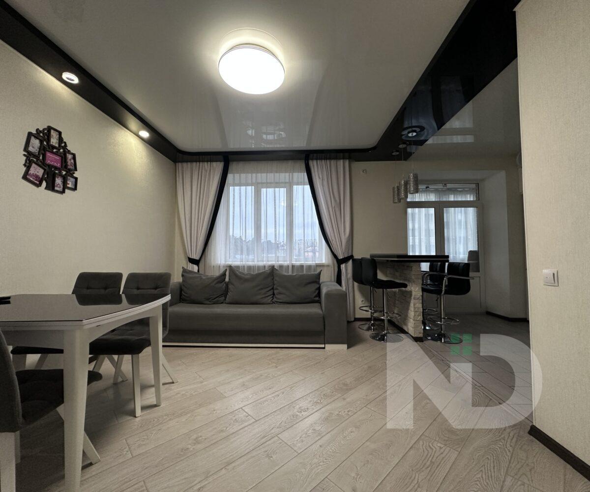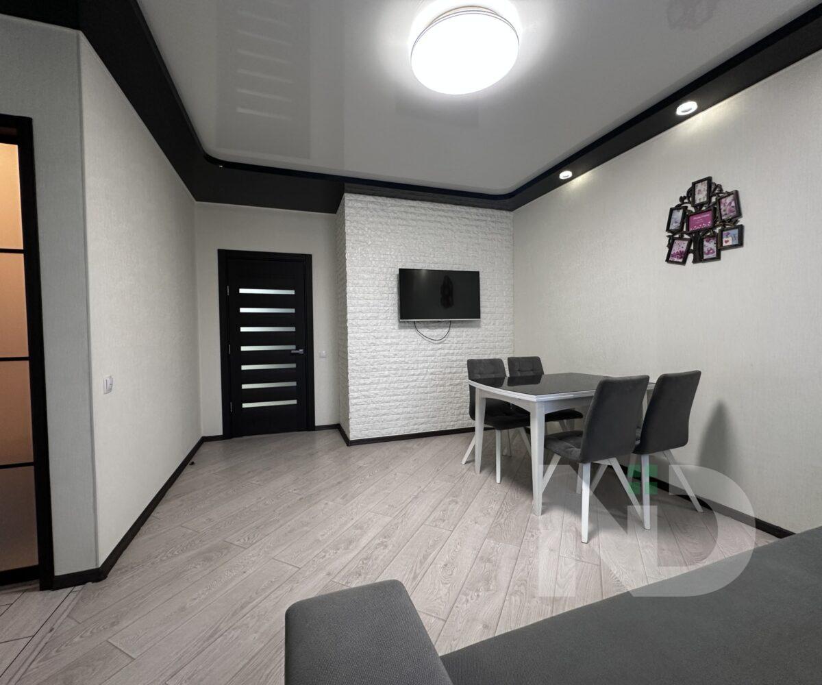 Квартира имеет большую просторную кухню-гостиную, которая является главной зоной для семейного отдыха и приема гостей. Светлый интерьер, панорамные окна и качественный ремонт создают атмосферу уюта и современности. Мебельная гостиная переходит в функциональную кухонную зону с барной стойкой, техникой и достаточным местом для хранения.