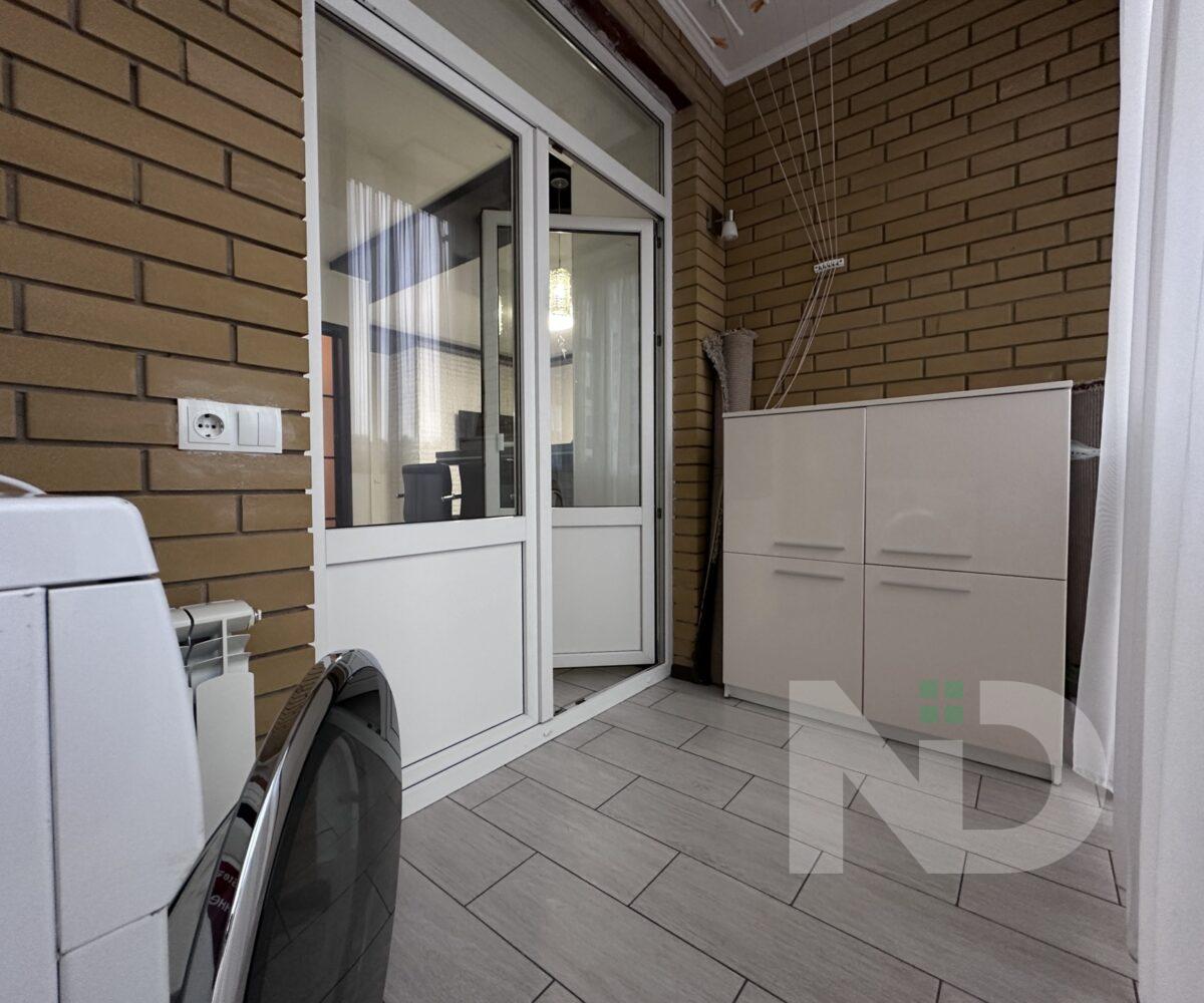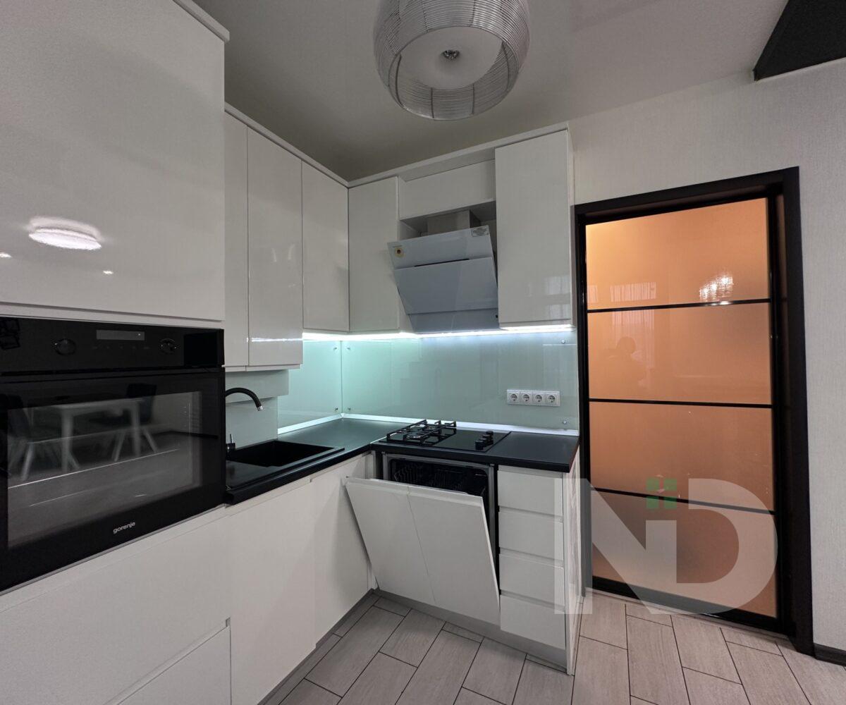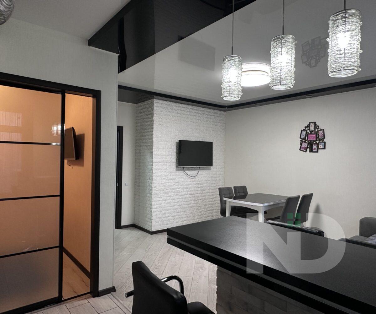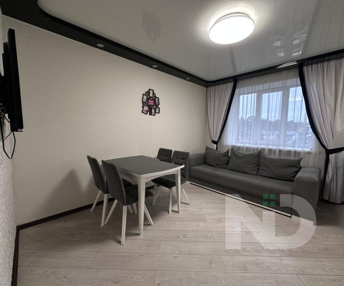 Квартира имеет большую просторную кухню-гостиную, которая является главной зоной для семейного отдыха и приема гостей. Светлый интерьер, панорамные окна и качественный ремонт создают атмосферу уюта и современности. Мебельная гостиная переходит в функциональную кухонную зону с барной стойкой, техникой и достаточным местом для хранения.