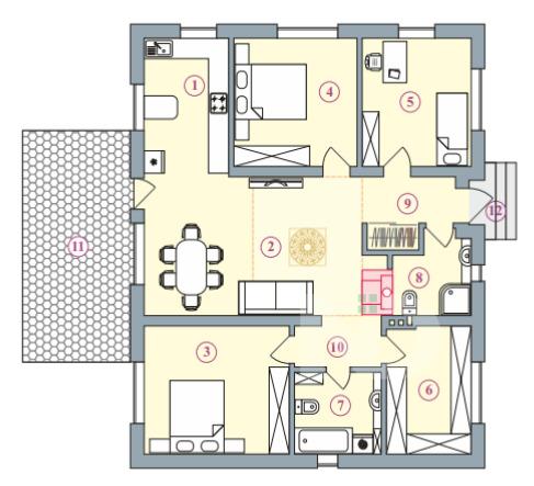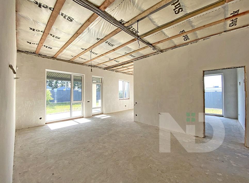 Общая площадь дома 132,8 кв.м ,включает в себя: кухню-гостиную (38 кв.м) , 4 просторных спальных комнаты (41,8 кв.м.), 2 санузла (11,1 кв.м), техническое помещение (9,3 кв.м.). С гостиной есть выход на крытую бетонированную террасу в 21,5 кв.м..