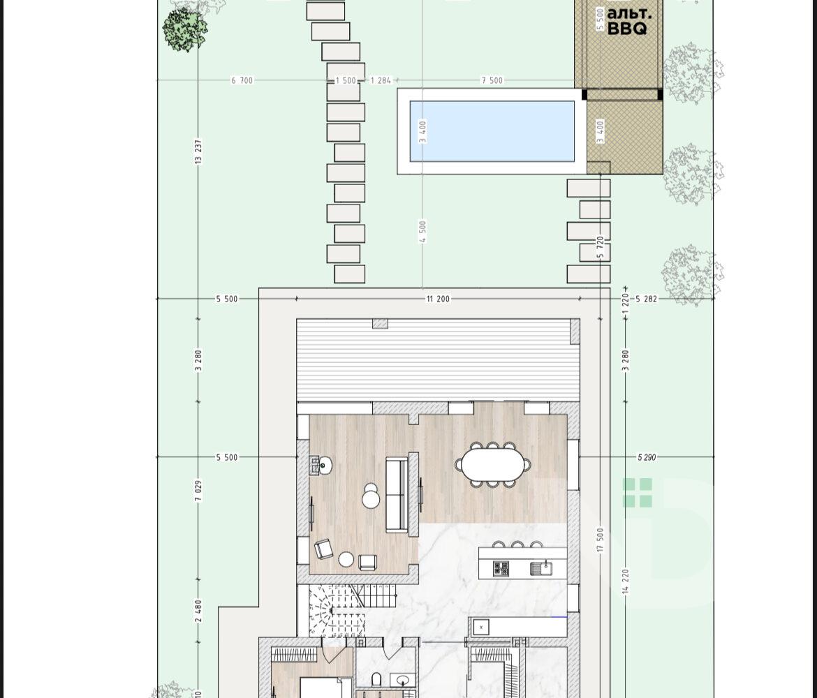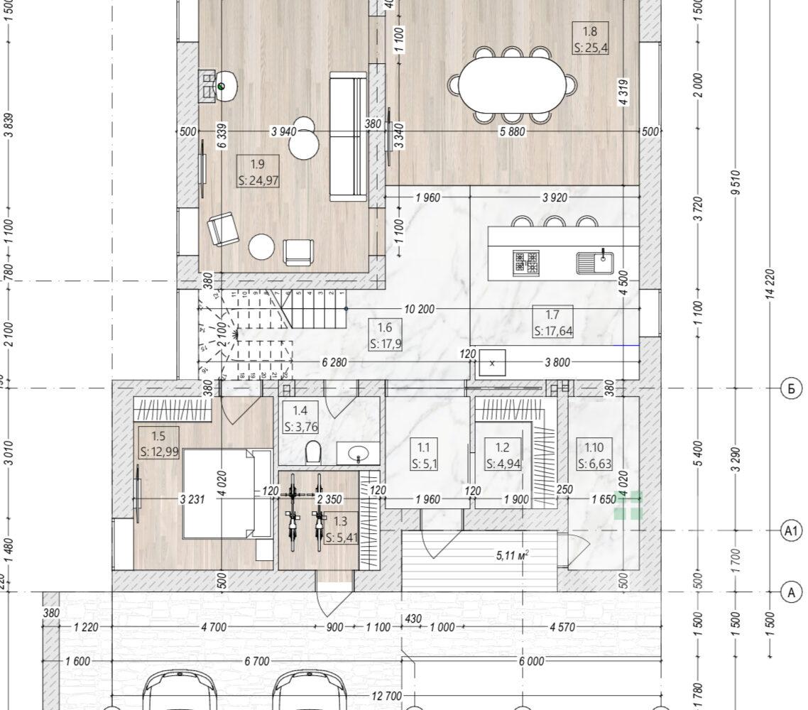 – кухня-столовая площадью 43 м2 и отдельная зона гостиной 25 м2