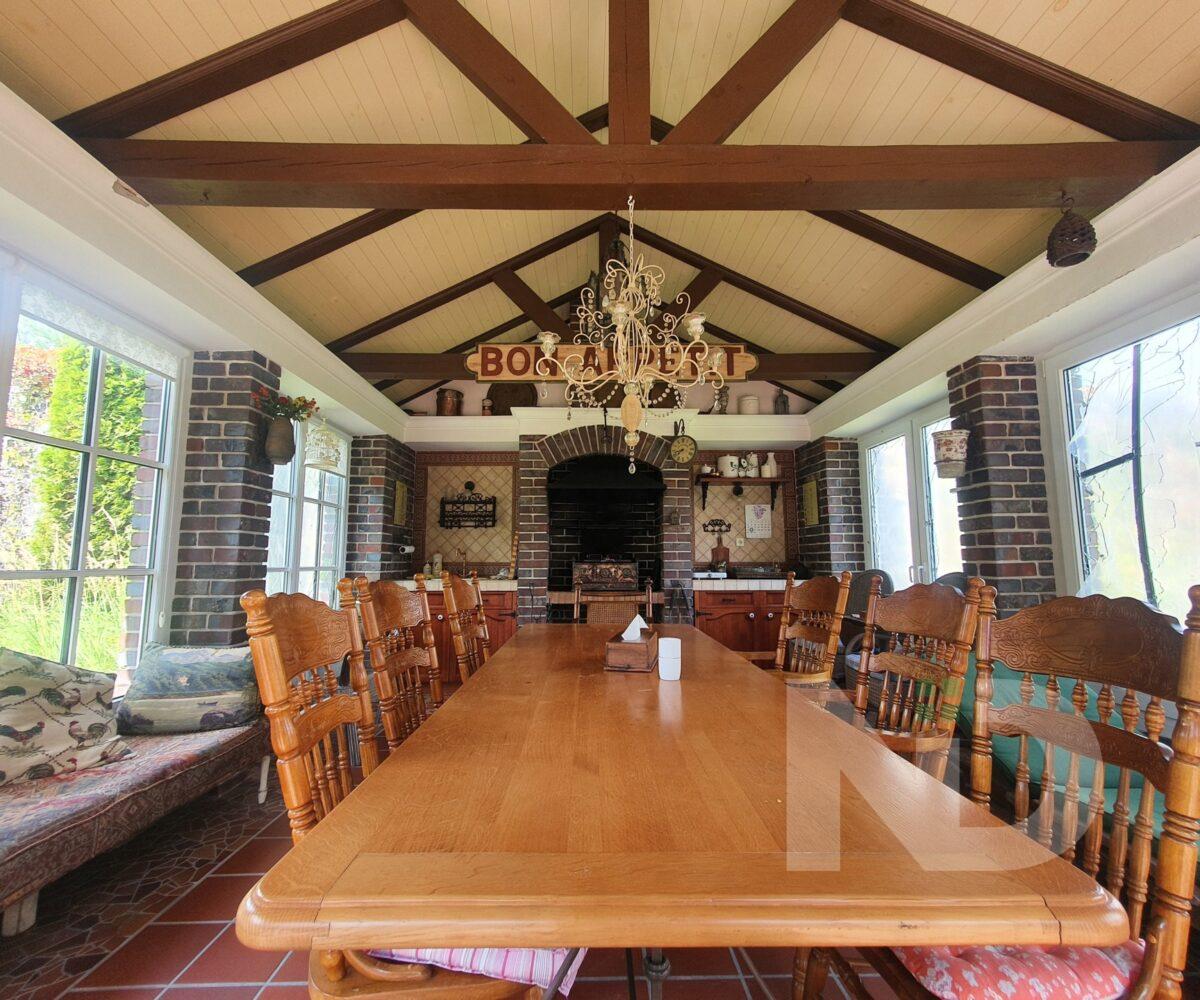 Коммуникации: газовое автономное отопление, две скважины с системой очистки и фильтрации воды, свет+генератор 5,5 кв, канализация – септик. На участке расположен бассейн, беседка, отдельный домик отдыха с барбекю и камином, садовая мебель, охраняемый домик со своим санузлом и спальной комнатой, винный погреб.