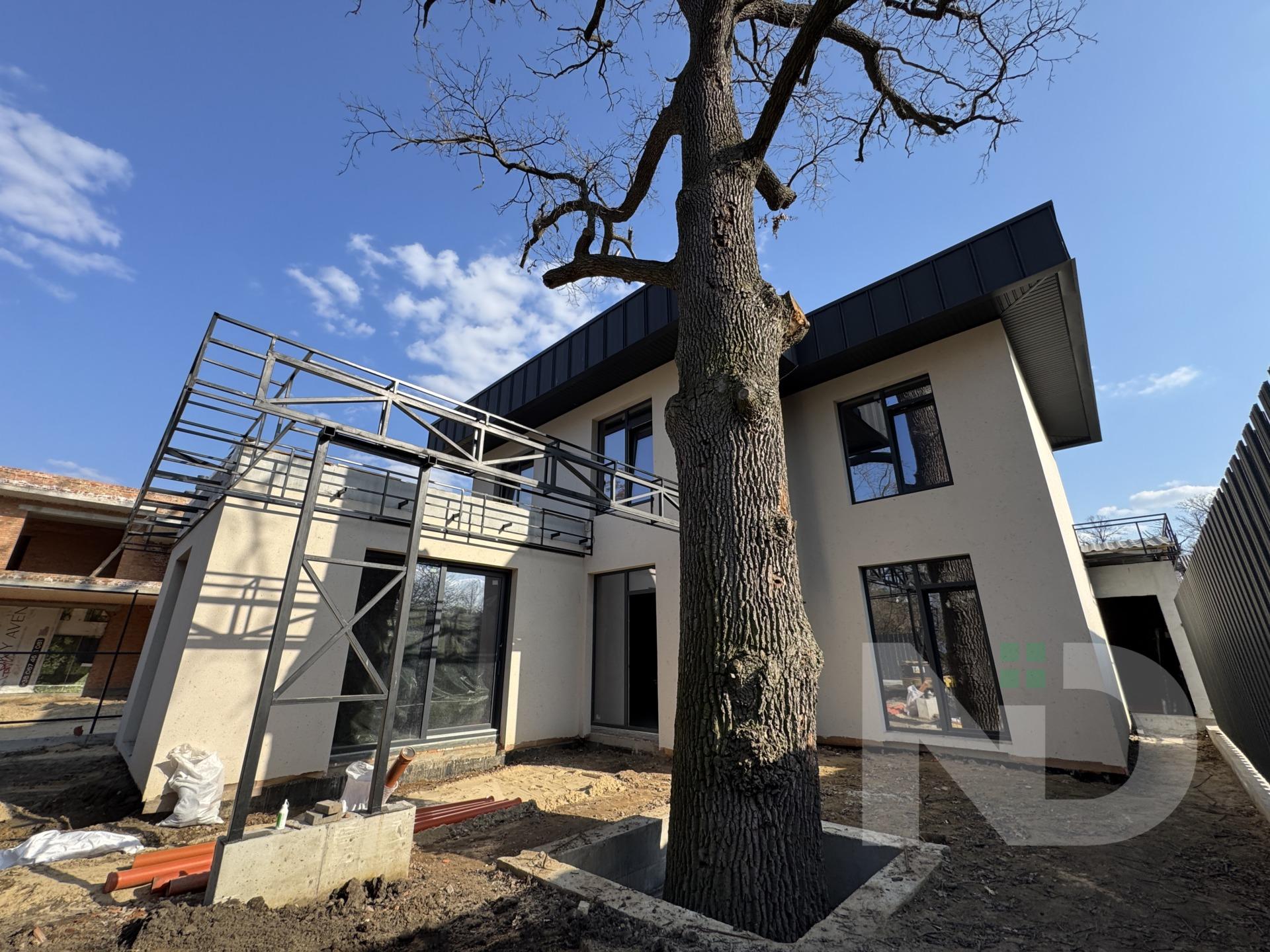 Имеется просторный навес на 2 автомобиля площадью 60 м², органично интегрированный в общую концепцию дома. Просторная терраса 30 м² станет излюбленным местом отдыха, семейных вечеров или встреч с друзьями.