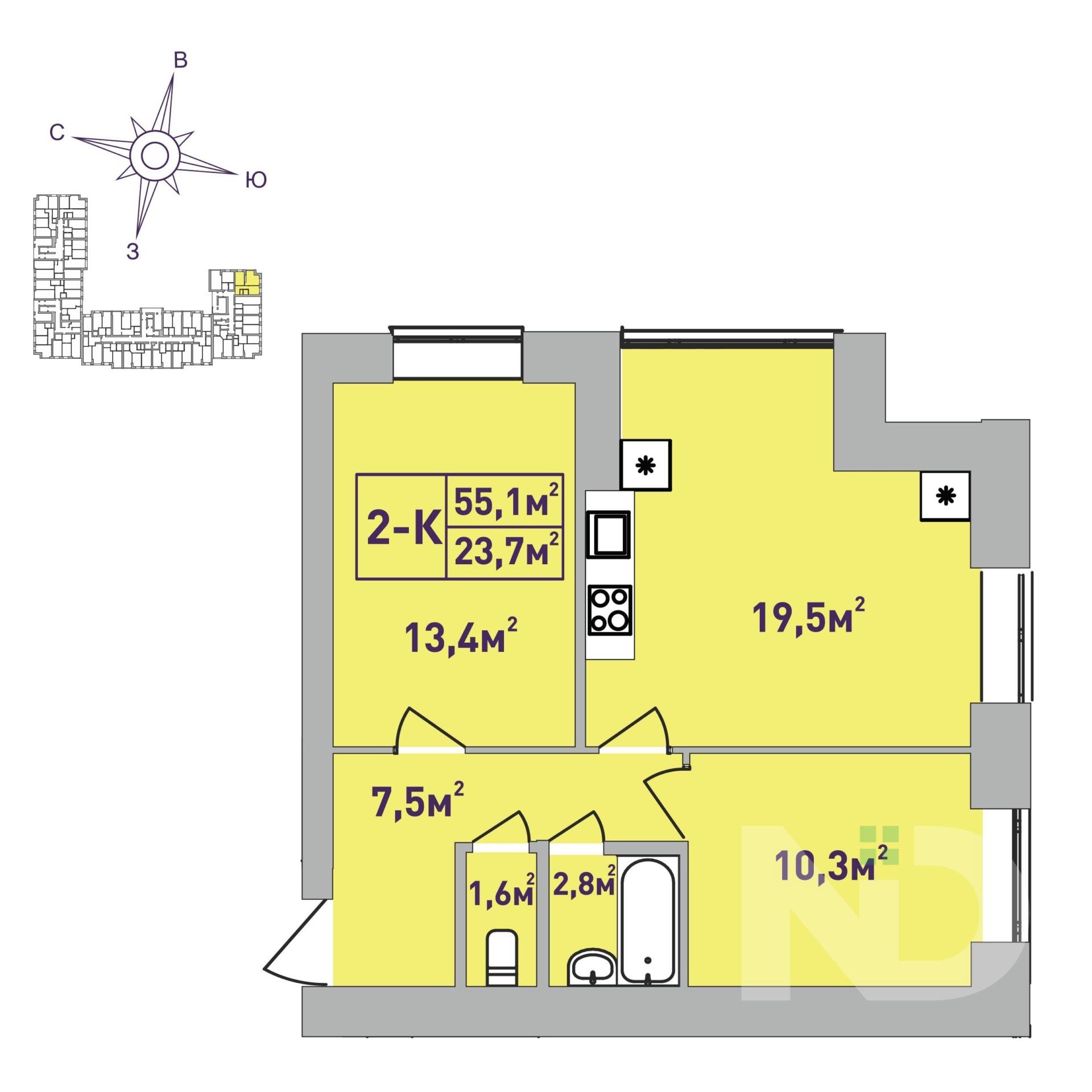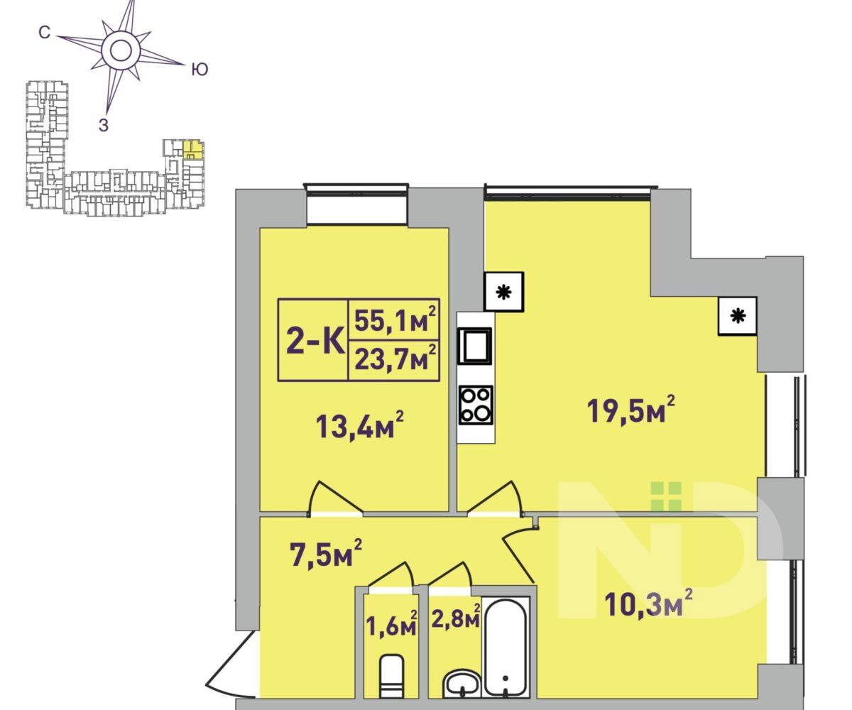 Общая площадь: 54,7м²;