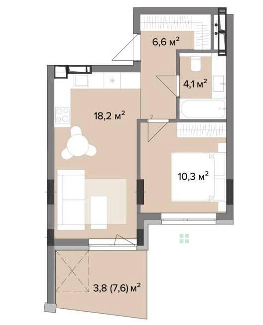 Планировка квартиры максимально удобна: просторная кухня-гостиная площадью 18,2 м² формирует главное жилое пространство, где можно организовать как зону отдыха, так и комфортное место для работы. Светлая спальня 10,3 м² легко вмещает необходимую мебель и создает частный уютный уголок. Санузел площадью 4,1 м² имеет удобную конфигурацию для устройства всех нужных элементов. В прихожей предусмотрено 6,6 м² – достаточно простора для вместительных шкафов и систем хранения. Дополнительным преимуществом является терраса площадью 3,8 м², которую можно превратить в комфортную зону отдыха или зеленый уголок.