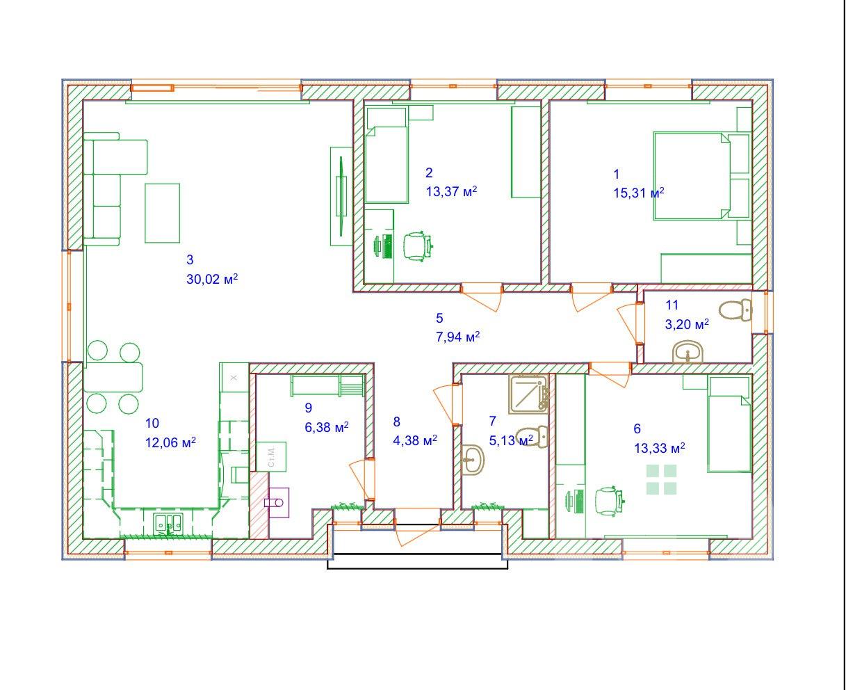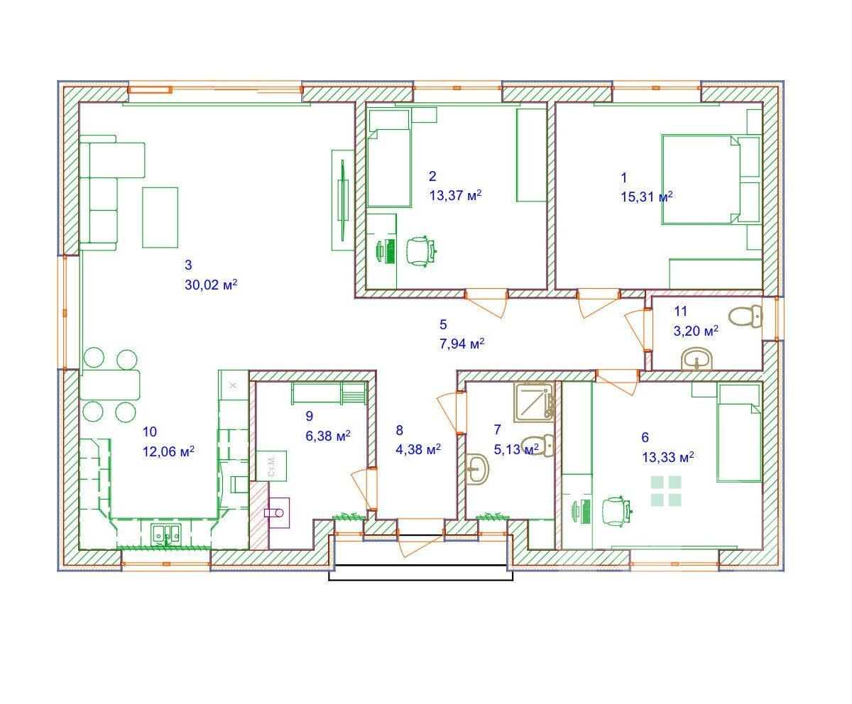 Планировка дома продумана для комфортного проживания семьи: три полноценные спальни, два санузла, просторная кухня-гостиная с выходом на террасу, где удобно обустроить зону отдыха. Пространство наполнено светом и создает ощущение уюта и функциональности.