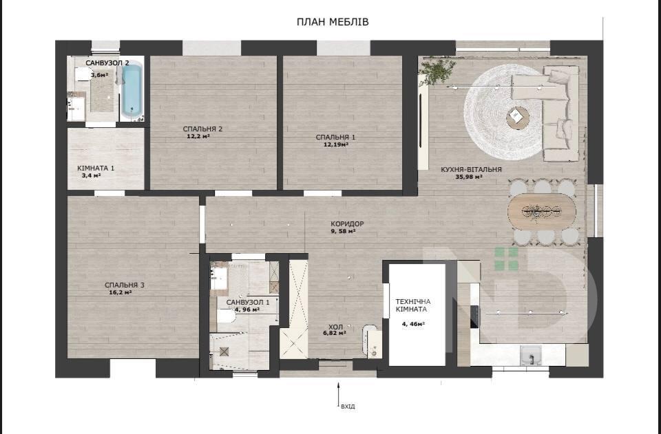 Продуманная планировка – просторная кухня-гостиная 36 м², три раздельные спальни (12–16 м²) и два санузла. Мастерспальня со своим гардеробом и санузлом.