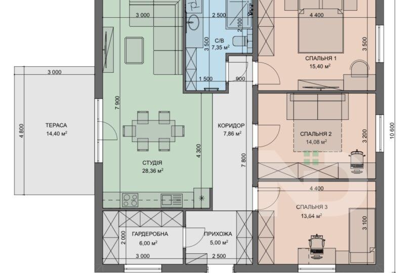 Общая площадь – 98 м², земельный участок 4 сотки. Планировка: 3 спальни, просторная кухня-студия с выходом на террасу, гардеробная, санузел, коридор и прихожая.