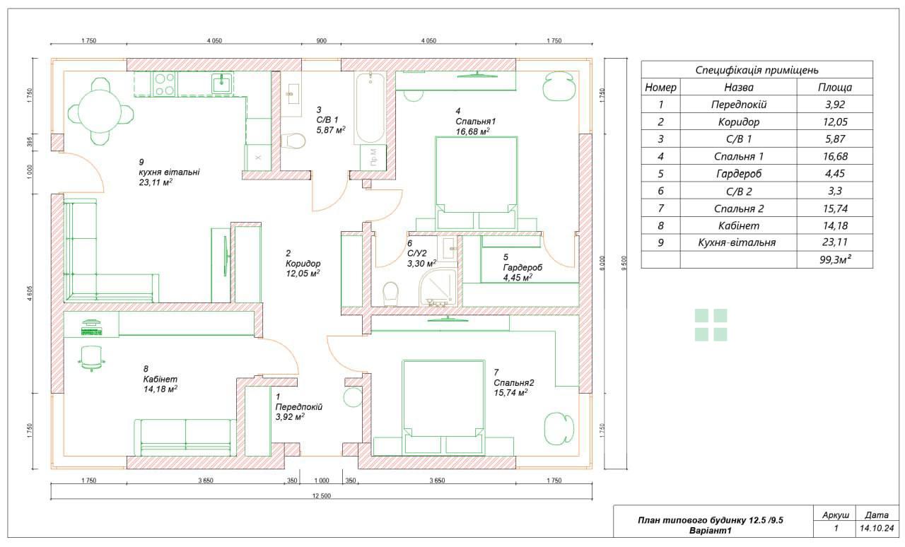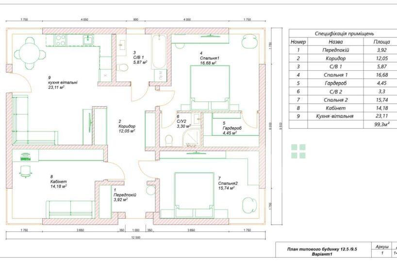 Дом общей площадью 99 м2. Главной особенностью планировки является кухня-гостиная – 23 м2 с выходом на выложенную плиткой террасу, 3 просторные спальные комнаты правильной формы и два отдельных санузла. Мастер спальня имеет гардероб и собственный санузел.